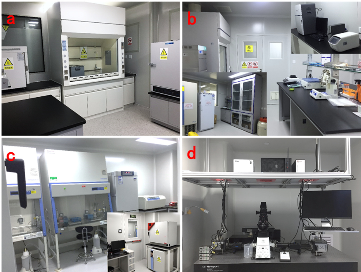 (2)分子生物学实验室建设及相关设备的购置,目前已用于生物界面材料前处理,分子克隆实验,生物界面样品低温保存等实验(图b);