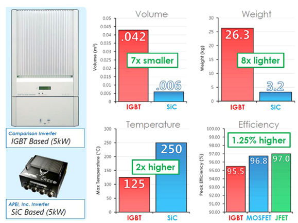 因此,当使用高温碳化硅功率??椴⑴浜鲜实钡娜裙芾砩杓?, 高温运行才有可能实现。高温运行在系统设计上的影响主要表现为:(1)可推高器件的开关频率,大大减小系统中磁性元件的体积和重量,从而实现整体系统的小型化和轻量化,降低成本。(2)高温运行能力可以降级系统的热管理设计,从而进一步减轻系统的重量和成本,且可能提升系统可靠性。