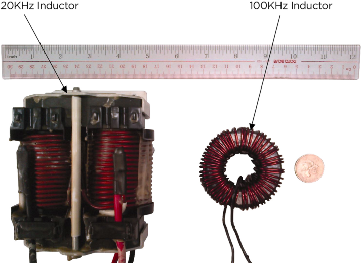 图七 Physical comparison between a 20 kHz and 100 kHz power inductor rated for 5 kW