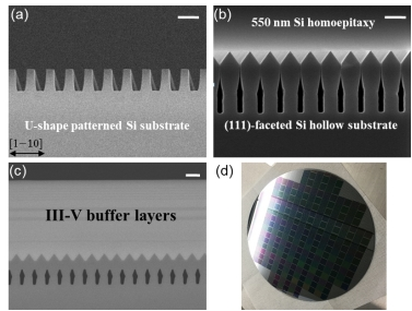 通过 CMOS 工艺线上的深紫外步进光刻机对8英寸硅和SOI 衬底进行图形制备(如图1(d)所示),并采取干湿法混合刻蚀工艺在衬底上构造周期性 U 型光栅结构(如图1(a)所示)。在该结构上通过硅缓冲层的同质外延构造出均匀且具有(111)晶面的V 型孔洞结构(如图1(b)所示),用于III-V 族异质外延时抑制反相畴和失配位错的沿伸,同时有效释放异质外延中的热失配,并进一步外延生长高质量GaAs缓冲层结构(如图1(c)所示),从而获得高质量的硅基砷化镓异质外延片。