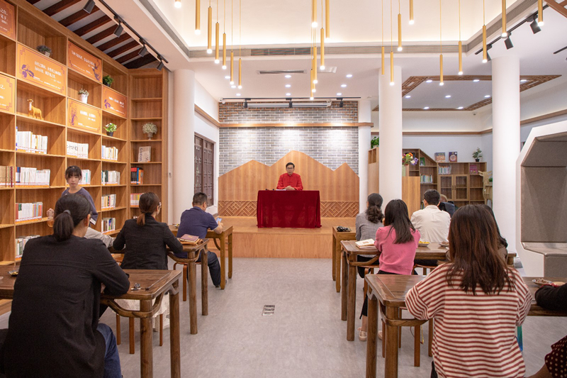 评书,一门诞生于古代活跃于田间地头,兴盛于茶坊酒肆,根植于百姓心间的中国传统口头讲说表演艺术。松山湖曲艺协会会长蒋志雄老师着一身长衫,带来说书《大话刘罗锅》表演,以当朝宰相刘墉与贪官和珅斗智斗勇的故事,将人生百态、善恶忠奸娓娓道来。党员们在茶香氤氲的热气中,或开怀大笑,或凝思领悟,受到教育启发从而获得坚定的力量。