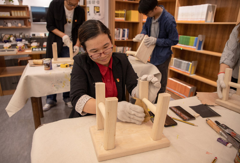 榫卯,是古典家具之魂,一榫一卯之间,一转一折之际,凝结着中国几千年传统木工文化的精粹和匠人精神。松山湖云舍联合创始人之一张鹏老师,为大家娓娓道来榫卯的前世今生。随后,大家在张老师的悉心讲解和指导下,钻孔做榫卯、拼装、打磨一张小板凳,弃繁从简刻画出生活的轮廓。每位参与者在低头制作的过程,切身体会工匠精神,也被祖先能工巧匠所折服,为中华木质的榫卯结构由衷的赞叹。