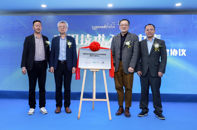 会上,实验室产业化委员付超、立讯技术总经理熊藤芳、中科微精董事长杨小君签署了联合中心共建协议;实验室常务副主任陈东敏、产业化委员赵卫、立讯精密副总经理丁远达、中科微精董事长杨小君共同为“通信技术新材料与光子先进制造联合工程中心”揭牌。