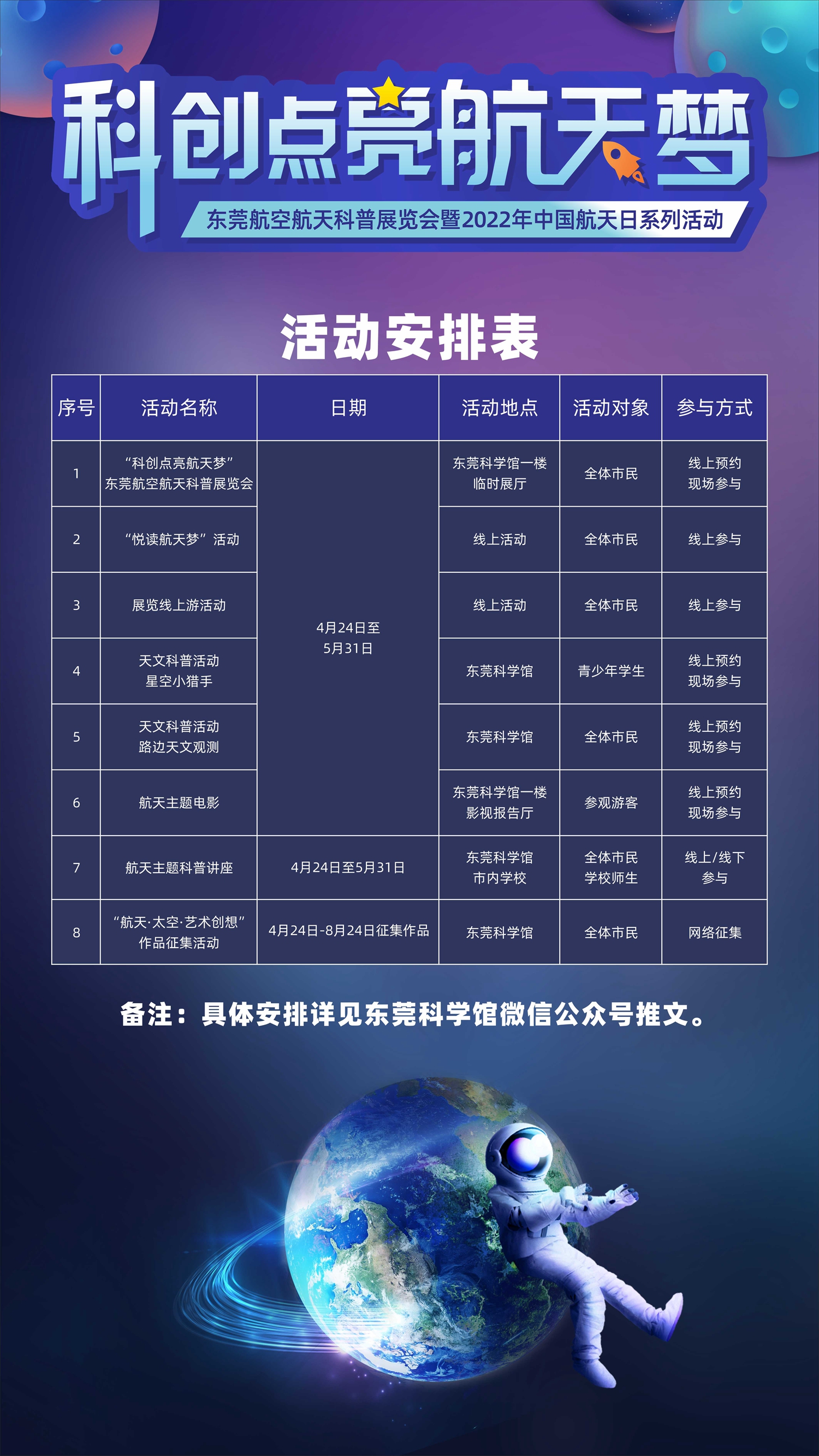 本次活动聚焦“科技创新+先进制造”城市特色,于4月24-5月底举办,向市民群众开放展出东莞航空航天高精尖装备制造设备与成品,展现莞企、科研机构航天制造力量,同步举办航空科普讲座、作品征集、天文观测等一系列主题活动,接续不断呈现航空科技精彩。