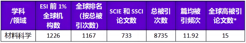 本期数据统计范围为2012年1月1日-2022年10月31日SCIE和SSCI论文数据。在材料科学领域,全球共有1226个机构进入ESI全球排名前1%,松山湖材料实验室位列全球第1167位,本期被ESI收录论文733篇,累积被引用8735次,篇均被引次数11.92次,高被引论文数为15篇,见下表。
