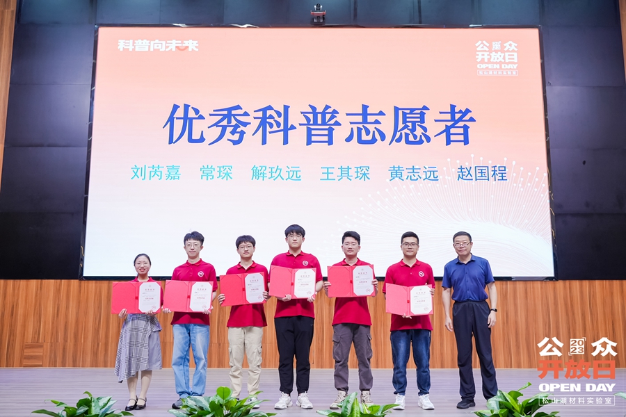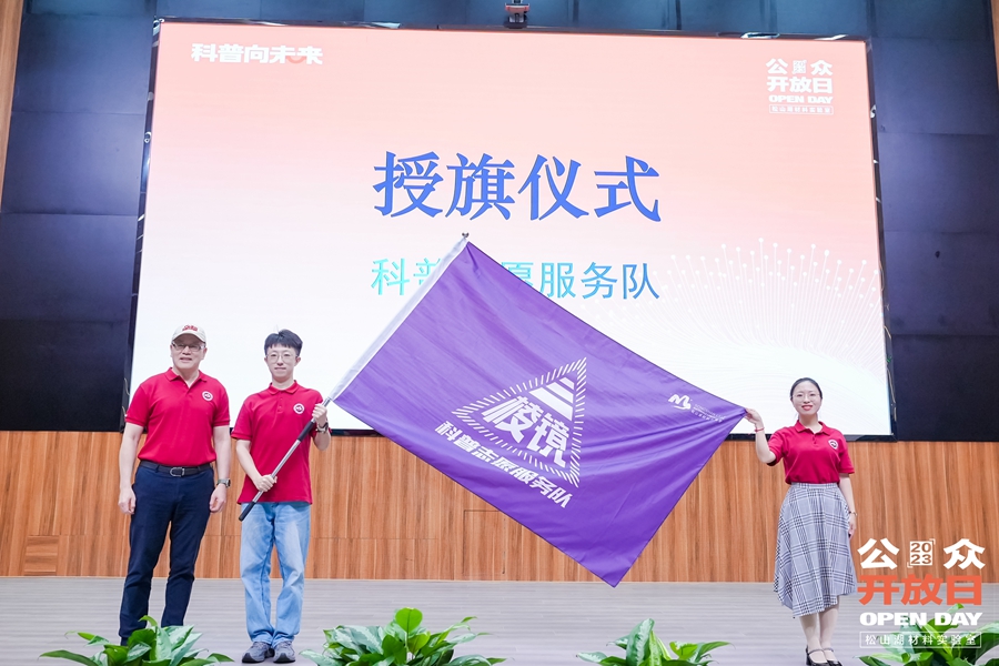 活动现场,陈东敏为“三棱镜”科普志愿服务队授旗,松山湖材料实验室党委书记、副主任冯稷为优秀科普志愿者颁发荣誉证书。