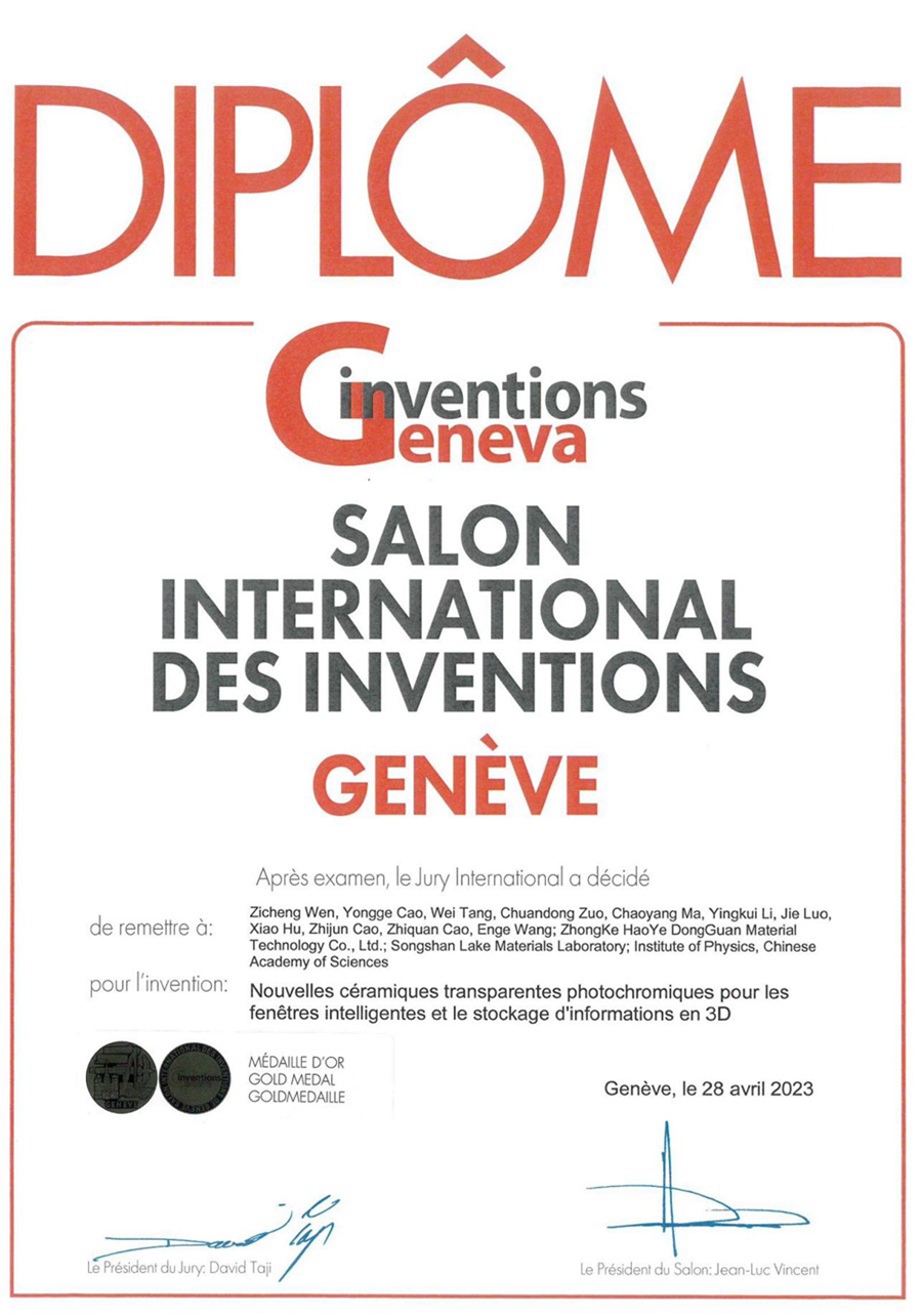 本届展会上,来自近40个国家和地区的800多个参展单位共展出约1000个发明项目。其中,松山湖材料实验室及其产业化公司中科皓烨(东莞)材料科技有限责任公司发明的“一种用于智能窗户和三维信息存储的新型光致变色透明陶瓷技术”从众多发明中脱颖而出,获评金奖。