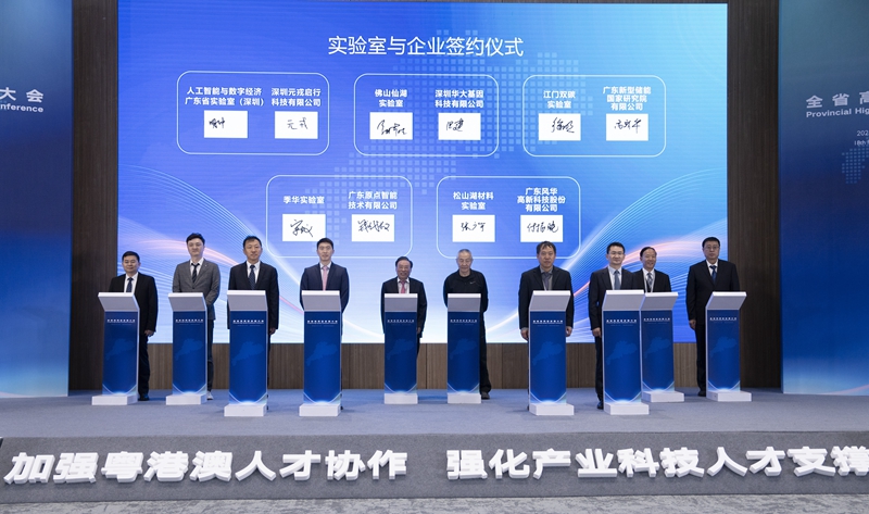 下午,全省高质量发展大会举行人才专题分组讨论,聚焦“加强粤港澳人才协作 强化产业科技人才支撑”主题,深入交流研讨。松山湖材料实验室主任汪卫华院士受邀参会,以《聚焦未来新材料发展 探索粤港澳人才协同共赢之路》为题作主旨发言,副主任张广宇代表实验室与广东风华高新科技股份有限公司签订室企合作协议。