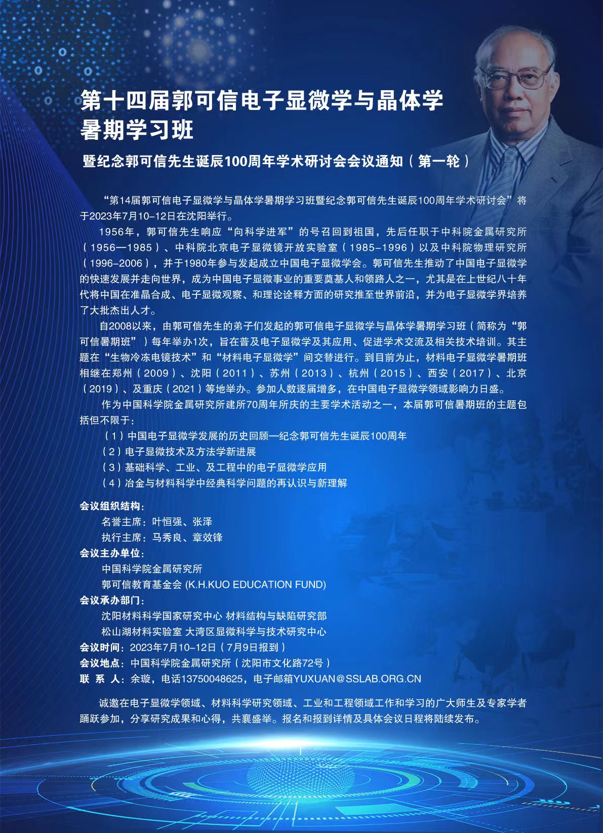 第十四届郭可信电子显微学与晶体学暑期学习班暨纪念郭可信先生诞辰100周年学术研讨会会议通知(第一轮)