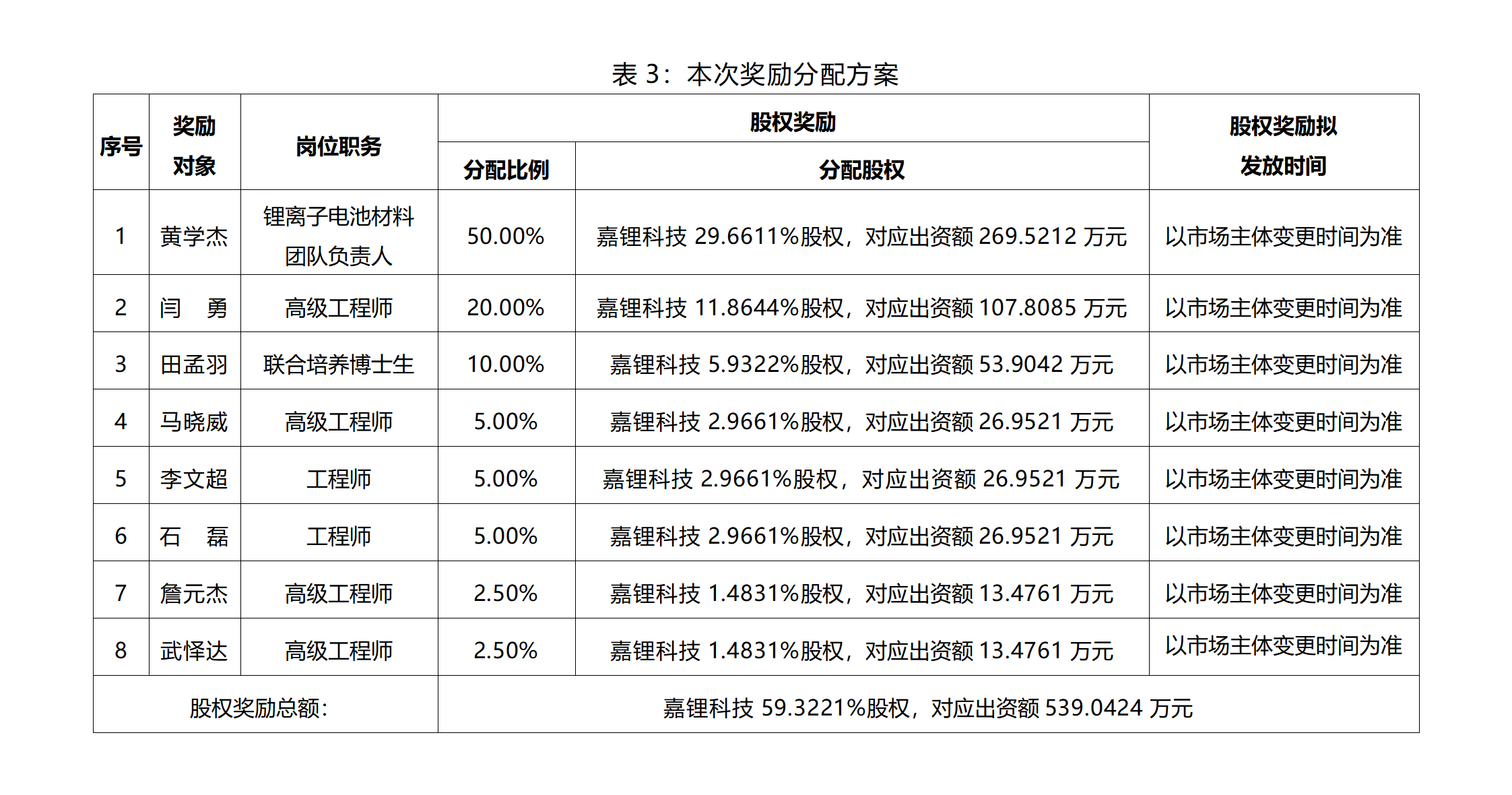 依据《松山湖材料实验室科技成果转化管理办法》第十六条规定,以材料实验室获得嘉锂科技74.1527%的股权中的80%作为股权奖励(合计539.0424万元,占嘉锂科技59.3221%的股权)。16项职务科技成果的完成人及成果转化贡献人员包括黄学杰、闫勇、田孟羽、马晓威、李文超、石磊、詹元杰、武怿达。本次奖励分配的具体方案如下: