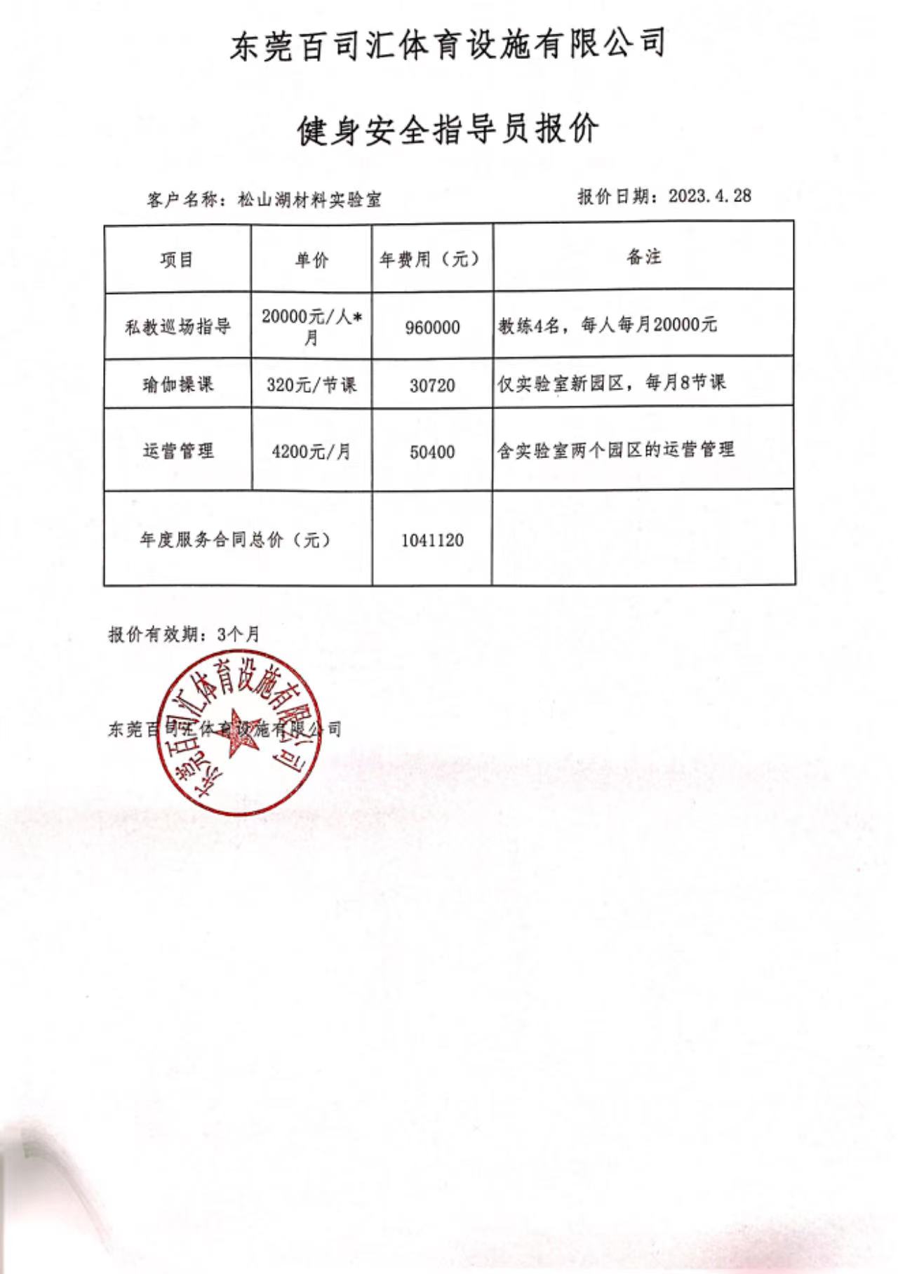 按照《松山湖材料实验室政府采购管理办法》规定,采购政府集中采购目录以外且单价或批量为松山湖材料实验室后勤基建部关于健身房健身安全指导与瑜伽操课采购项目,采购预算 96万元。经采购需求部门进行市场调研及比价后,拟由东莞市极速体育管理有限公司提供(或承担),服务内容:健身安全指导服务以及瑜伽操课服务 ,价格: 951,200元。