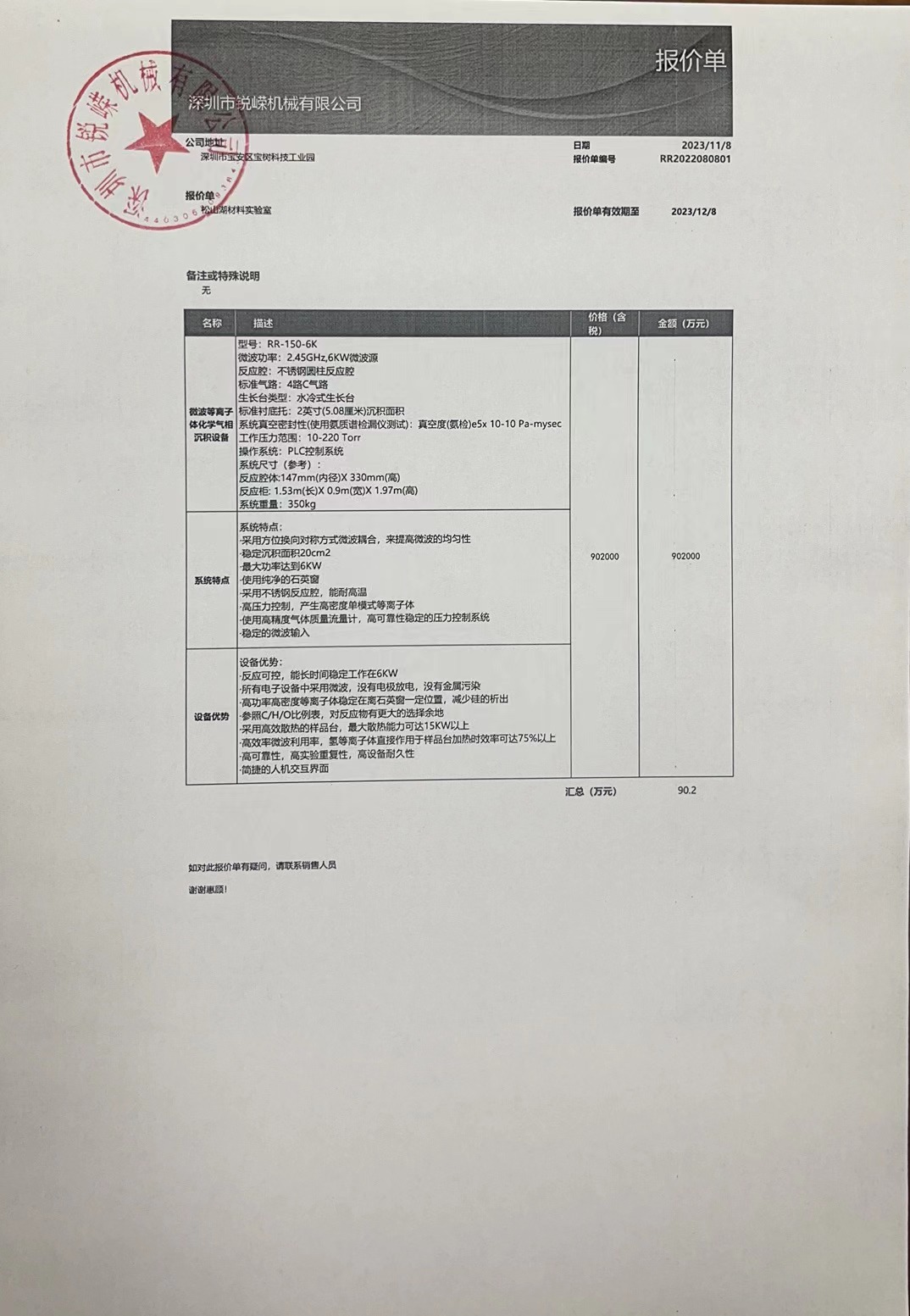松山湖材料实验室材料制备与表征平台关于MPCVD微波等离子体化学气相沉积设备采购项目(50-100万)征求意见公示