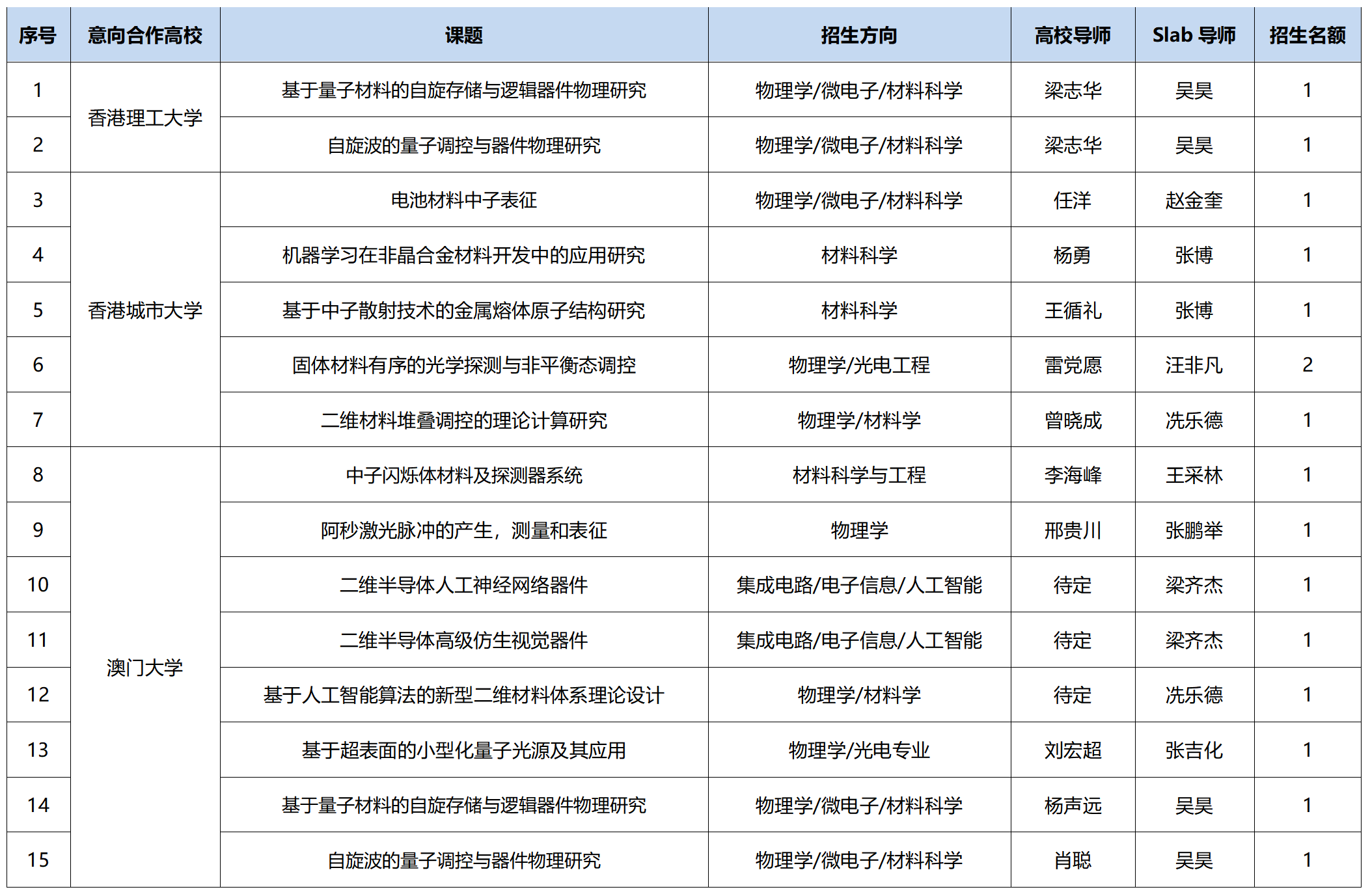松山湖材料实验室2024年夏令营拟于2024年7月5-7日举行,本次夏令营旨在帮助营员开阔视野,增进学识,通过接触物理学、材料学等领域的前沿科研专家,提升相关领域的科研知识储备。通过举办本次夏令营,实验室也为基础扎实、素质全面、表现突出、热爱科研的同学提供一个前往香港理工大学、香港城市大学、澳门大学继续深造的良好机会。若通过夏令营考核,获得“优秀营员”称号,将被推荐到松山湖材料实验室与香港理工大学、香港城市大学、澳门大学合作的联合培养博士生项目中,学生学籍在高校,联合科研工作在松山湖材料实验室和高校进行开展。