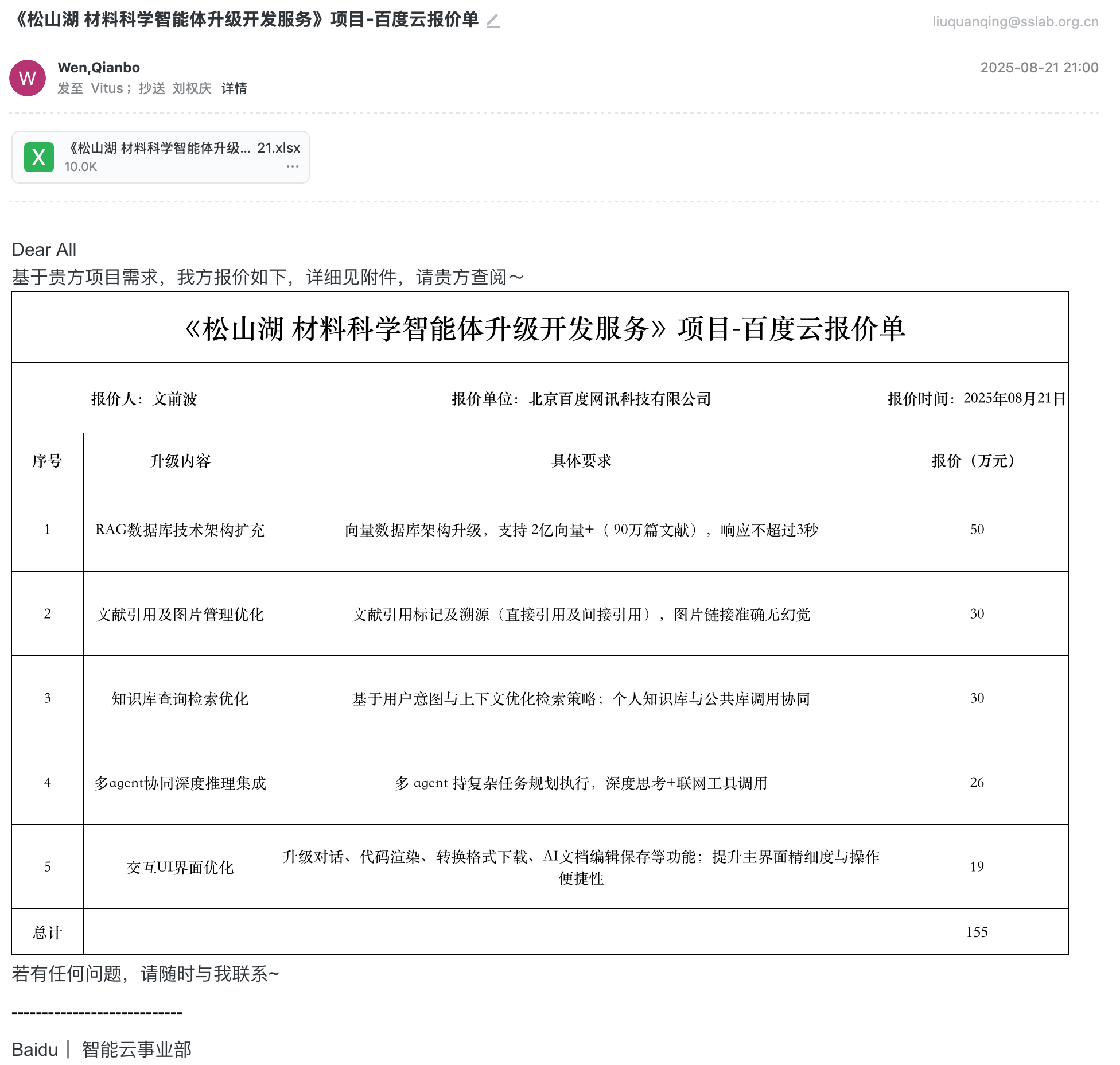 松山湖材料实验室材料计算与数据库平台关于材料科学RAG知识问答系统升级采购项目,采购预算 98万元。经采购需求部门进行市场调研及比价后,拟由深圳探知未来科技有限公司提供(或承担),产品型号: 材料科学智能体升级服务,价格: 980,000元。