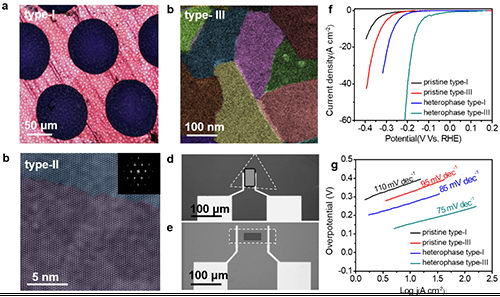 图1.(a)单层二硫化钼单晶(b)近单晶单层二硫化钼2H-2H畴区边界(c)多晶单层二硫化钼边界(d,e)二硫化钼析氢催化器件(f,g)2H-2H畴区边界与2H-1T相边界催化性能。 |