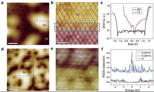 图2.(a-c)多相二硫化钼的STM表征(d,e)氢化处理后样品STM表征(f)相边界原子的态密度。 |