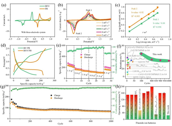 BFO电极具有明显增强的可逆性、倍率特性及稳定性。首先,BFO电极电导率得到有效提高,活性物质能够充分参与反应,提供更高比容量和可逆性。其次,BFO电极的体积膨胀问题得到有效改善,电极材料在循环过程中不发生活性物质剥离及电极破坏等问题,从而提高电极循环稳定性。最后,电极反应动力学增强,缓解了氟化过程中Bi3+溶解流失的问题,提高了电极材料的稳定性。