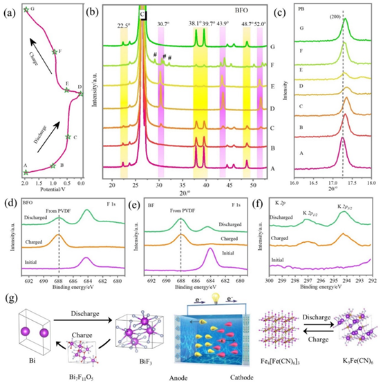 离位XRD和XPS表征结果表明,在BFO//PB电池放电过程中,在BFO电极中金属铋发生氟化反应生成氟化铋,同时钾离子插层进入PB电极;BFO//PB充电过程中,BFO电极中发生去氟化反应先生成氟氧铋最终转化为单质铋,同时钾离子在PB电极中脱出进入电解液。