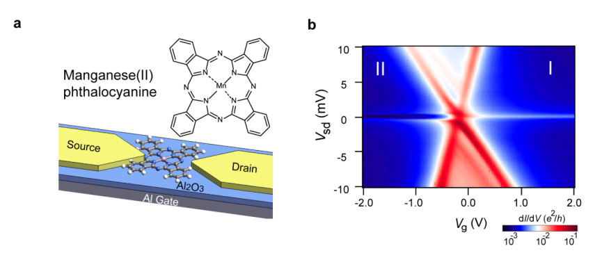 图1 a 酞菁锰分子结构及器件示意图 b 单个酞菁锰分子晶体管器件低温下输运特性