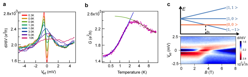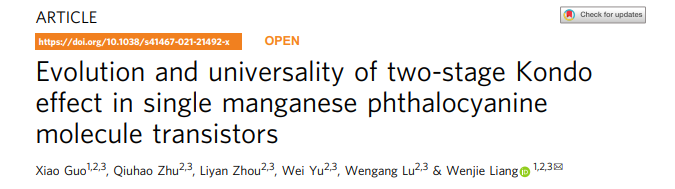 该论文第一作者为郭潇,通讯作者为梁文杰。该工作得到了National Basic Research Program of China (2016YFA0200800)、中科院(XDB30000000,XDB07030100)、Sinopec Innovation Scheme (A-527)等的支持。该研究成果以“Evolution and universality of Two-stage Kondo effect in single manganese phthalocynine molecule transistors” 为题,发表在 Nature Communications 12:1556 (2021) 上。