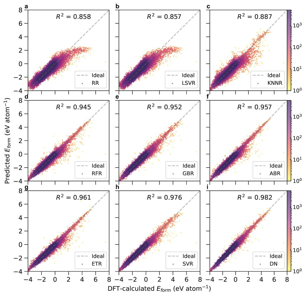 图1. 人工智能模型vs量子力学计算。图为不同的机器学习算法的预测精度,其中图(i)中的DenseNet模型达到R2 = 0.982 和MAE = 0.072 eV atom−1。