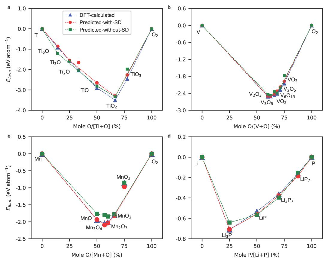 图2. (a)Ti-O,(b)V-O,(c)Mn-O,和(d)Li-P 化学系统的热力学相图。蓝色三角形为通过量子力学计算得到的形成能,红色圆形为模型预测数值??杉P涂山献既返脑げ饬孔恿ρЪ扑憬峁?。