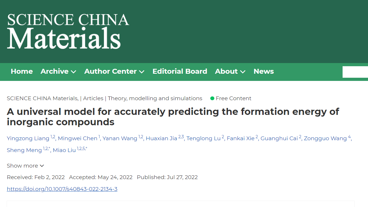 “人工智能+大数据”变革性地改进了诸多行业的生产力,也为材料科学的进步带来新的机遇。近日,松山湖材料实验室/中国科学院物理研究所孟胜研究员和刘淼副研究员团队,在《SCIENCE CHINA Materials》上发表了题为“A universal model for accurately predicting the formation energy of inorganic compounds”的研究论文,该工作依托超大规模的第一性原理计算材料数据集,构建出无机晶体形成能的高精度预测泛化模型,为新材料搜索提供了一种高效、低成本的结合能预测手段。