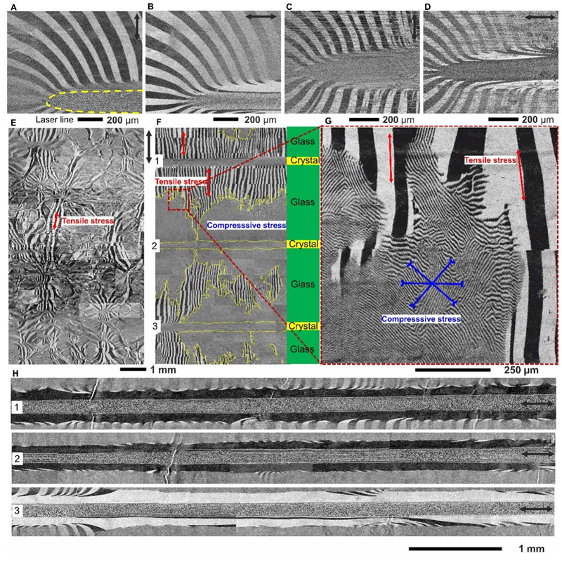 图 3 激光处理对Fe-Si-B金属玻璃的磁畴分布和内应力分布状态