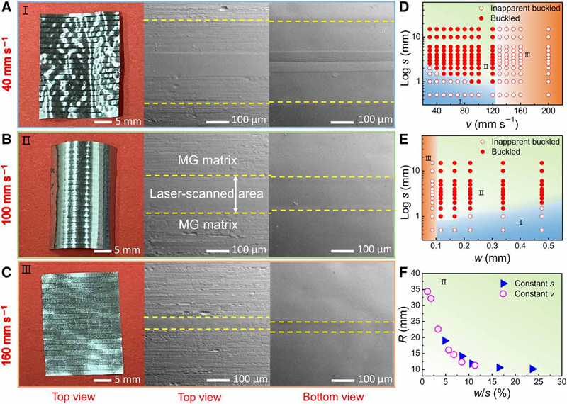 该工作中采用一步成型、快速和可扩展的激光图案化方法设计制造金属玻璃3D 屈曲结构。这种方法可推广到通过改变材料不同部位的密度和/或模量,具有适当的尺寸错配的任何金属材料。这对开发金属玻璃的功能性应用具有重要的科学和技术意义;并对实现金属材料的 3D 屈曲结构具有启发和指导意义。