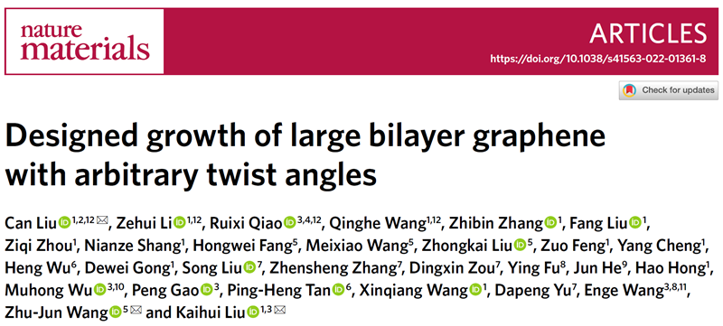 2022年9月15日,松山湖材料实验室/北京大学刘开辉教授、王恩哥院士团队与合作者,在顶级学术期刊Nature Materials上发表了题为“Designed growth of large bilayer graphene with arbitrary twist angles”的研究论文,首次提出“预堆叠衬底-角度复制单晶生长”的新生长策略,在宏观控制衬底旋转角度的条件下,利用二维晶体严格的外延角度复刻生长行为,以及金属衬底预熔平面自铺展效应,成功操控了双层石墨烯堆叠转角生长。该策略在二维晶体制备领域提供了宏观尺度下精准操控双层堆垛结构的新路径,有望为大批量制备可控转角多层二维材料领域提供一种全新的低成本方案。