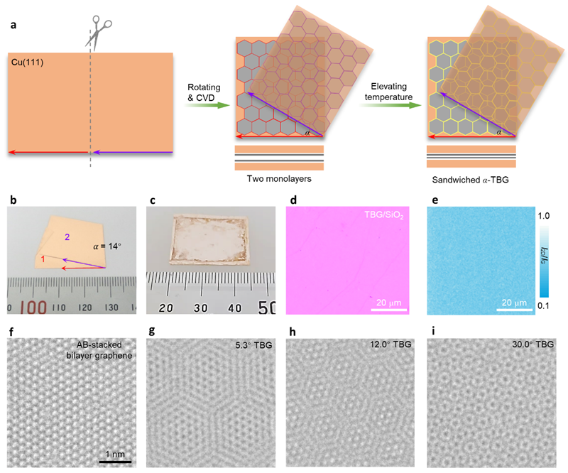 图a 转角双层石墨烯生长设计示意图;b-e 制备的14°转角双层石墨烯结果;f-i 转角双层石墨烯的普适制备