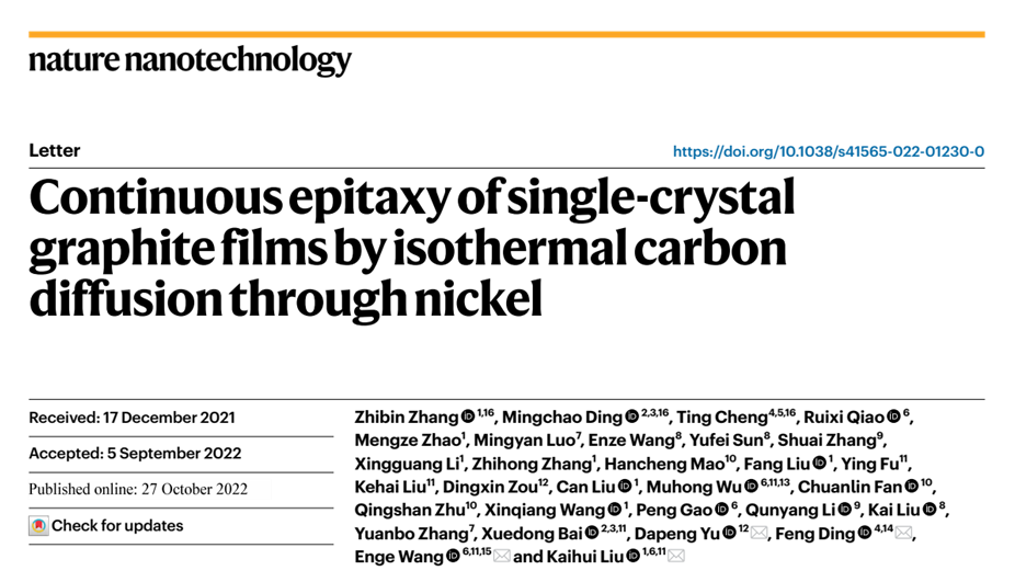 2022年10月27日,相关研究成果以“镍上碳原子恒温扩散实现单晶石墨的连续外延生长”(Continuous epitaxy of single-crystal graphite films by isothermal carbon diffusion through nickel)为题,在线发表于《自然·纳米科技》(Nature Nanotechnology)。