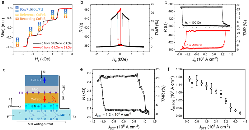 图2. a-c:拓扑SOT-MRAM的TMR曲线和SOT写入过程;d-e:SOT+STT协同操控磁矩的写入过程