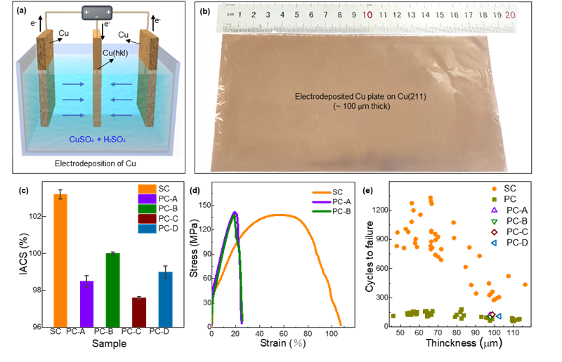 (c-d)电镀单晶铜片及工业用多晶铜片的导电率(c)、力学拉伸曲线(d)及失效循环次数随厚度的变化(e)。