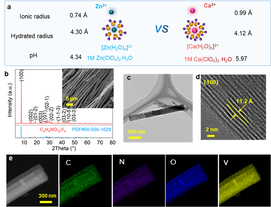 图1. a) Zn2+ 和 Ca2+ 离子半径、水合离子半径以及相应的 1 m Zn(ClO4)2 和 1 m Ca(ClO4)2 水溶液 pH 值的比较。PVO 的表征:b) XRD 图谱(插图:FESEM 图像);c) 低倍 TEM 图像;d) HRTEM 图像,其中可识别 (100) 晶面;e) HAADF 和EDS 图谱。