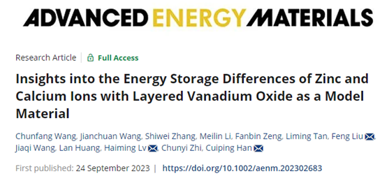 相关成果以“Insights into the Energy Storage Differences of Zinc and Calcium Ions with Layered Vanadium Oxide as a Model Material”为题在国际著名期刊Advanced Energy Materials上发表。联合培养博士王春芳为第一作者,中南大学刘锋副研究员、松山湖材料实验室副研究员吕海明和中科院深圳先进院韩翠平副研究员为共同通讯作者,上述研究工作得到了松山湖材料实验室创新样板工厂团队项目、广东省基础与应用基础基金,国家自然科学基金和深圳优秀青年基础项目等支持。