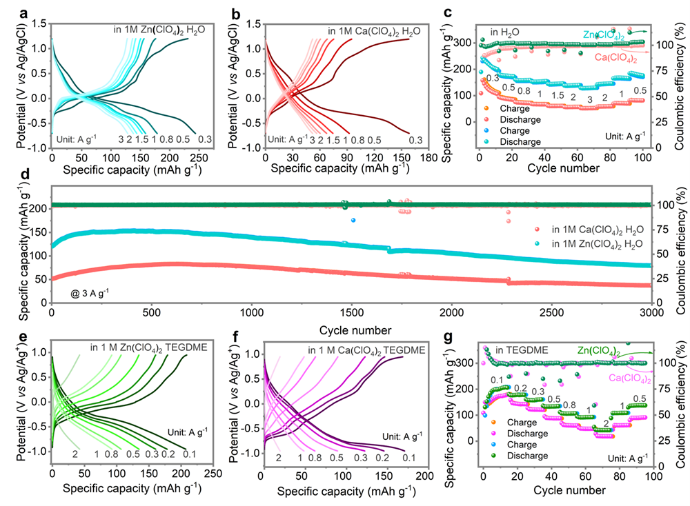 图2. a) PVO 在 1 m Zn(ClO4)2 水溶液中、b) 在 1 m Ca(ClO4)2 水溶液中的放电/充电曲线,以及 c) 在 0.3-3 A g-1 的不同电流密度下,PVO 在 ZIB 和 CIB 水溶液中的速率能力。PVO 在 e) 1 m Zn(ClO4)2 TEGDME 溶液、f) 1 m Ca(ClO4)2 TEGDME 溶液中的放电/充电曲线,以及 g) 在 0.1-2 A g-1 的不同电流密度下,在基于 TEGDME 的 ZIB 和 CIB 中的速率能力。