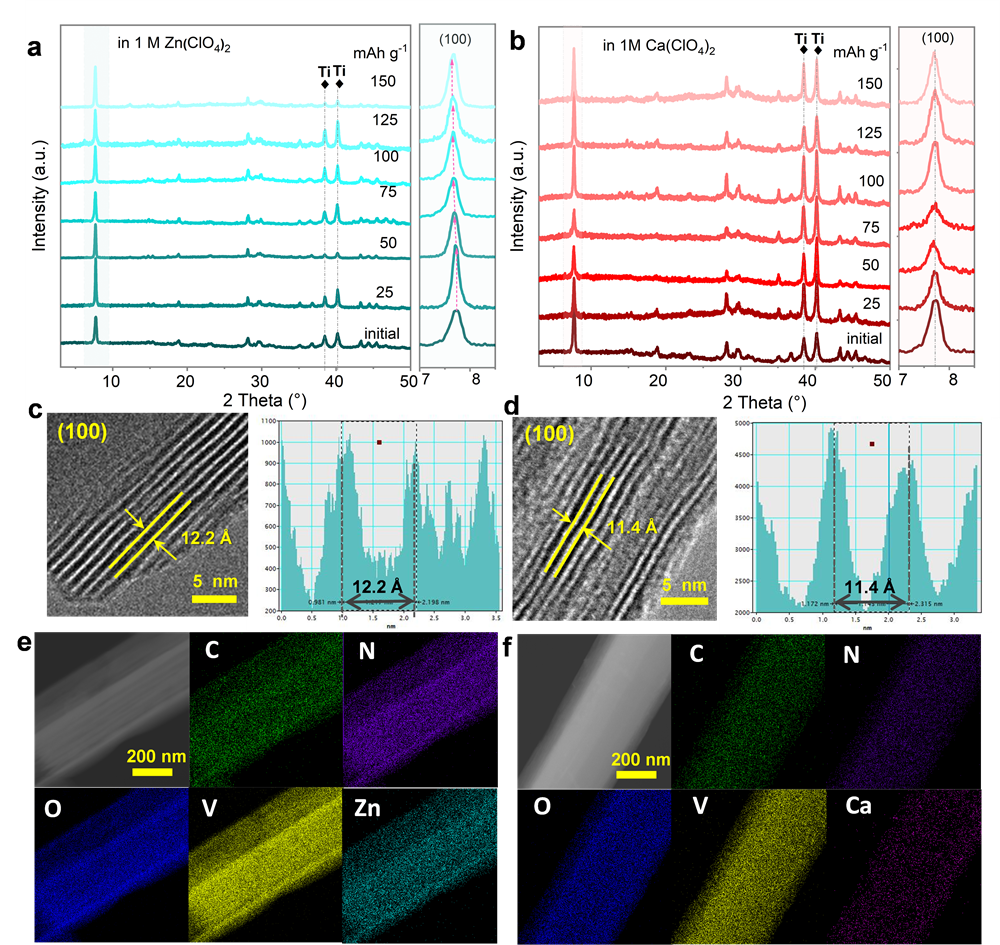 图3 .ZIBs a) 和 CIBs b) 水溶液中不同比容量截止值的原位 XRD 图。比容量截止值为 150 mAh g-1 的 PVO:ZIBs c) 和 CIBs d) 中的 HRTEM 和晶面间距、ZIBs e) 中的 HAADF 和 EDS 图谱、CIBs f) 中的 HAADF 和 EDS 图谱。