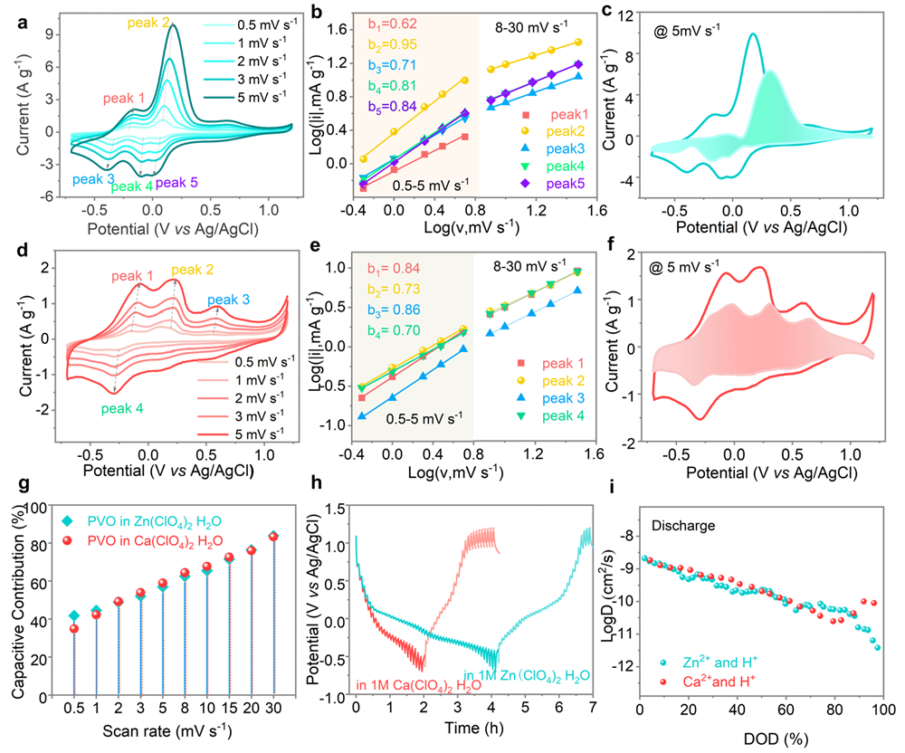 图6. a) Zn2+ 和 Ca2+ 与 PVO 的动力学差异。b) 峰值电流(i)和扫描速率(v)之间的线性函数刺激的 b 值:扫描速率为 0.5-30 mV s-1 时 CV 中的 log i-log v。e) 峰值电流(i)和扫描速率(v)之间的线性函数激发的 b 值:扫描速率为 0.5-30 mV s-1 时 CV 中的 log i-log v。g) 不同扫描速率下的电容贡献比;h) 0.2 mA 电流密度下的 GITT 曲线;i) ZIB 和 CIB 水溶液中阳离子的相应扩散系数(D)。