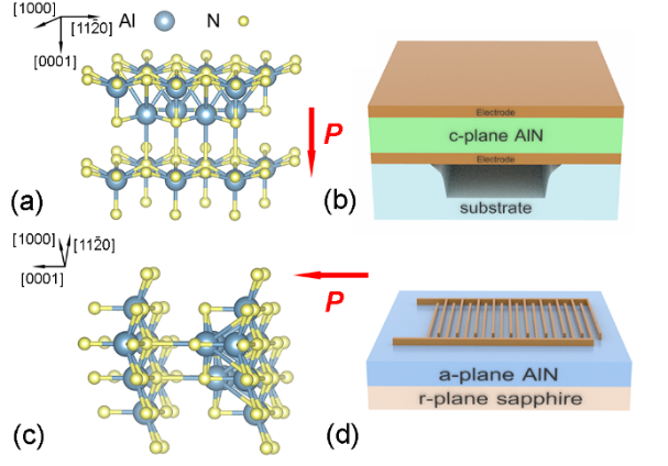 图1 (a) 传统c面氮化铝薄膜晶体结构; (b)基于c面氮化铝薄膜的体声波谐振器结构; (c) a面氮化铝单晶薄膜晶体结构; (d) 基于a面氮化铝薄膜的的表面声波谐振器结构。(其中箭头P指向为极化方向)