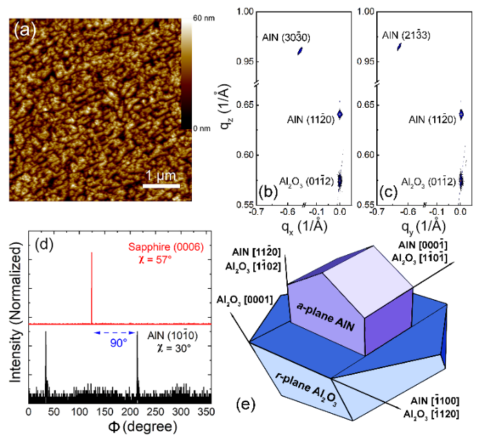 方向的X射线衍射倒空间结果; (d) 蓝宝石(0006)衍射晶面和氮化铝衍射晶面的X射线衍射Φ扫描; (e) r面蓝宝石衬底上a面氮化铝的结构示意图。