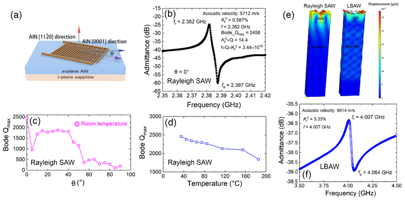 基于高温退火a面氮化铝单晶薄膜的谐振器结构示意图如图3a所示。为了证明施加电场方向与c轴之间相对角度的重要性,我们制备了一组具有不同夹角θ的谐振器,相邻谐振器之间的θ以5°为步进渐变。当θ=0°时,施加电场方向与氮化铝c轴方向平行,瑞利表面波的fr和fa 分别为2.382和2.387 GHz,Kt2=0.587%,而品质因子值高达2458,经优化后可提升至3731。此外,即使是在185°C条件下,谐振器的品质因子仍然高达1847,证明了其优异的高温工作能力。随着θ逐渐增大,瑞利共振与品质因子逐渐减弱。除瑞利表面波(Rayleigh SAW),谐振器同时在4.00 GHz频段激发出高频横向体波(LBAW),如图3f所示,当θ=0°时,LBAW的 fr和fa的频率分别为4.007和4.064 GHz,计算其对应的Kt2值为3.33%,计算得到声速高达9614 m/s,该工作是氮化铝体系中首次仅通过平面叉指电极激发高速横向体波。该结果证实了非极性面氮化铝单晶薄膜在高频声学谐振器领域具有巨大优势。特别值得一提的是,实现上述谐振器优异性能的单晶氮化铝薄膜表面粗糙度高达~7 nm,证明了此项技术的鲁棒性与产业前景。这一研究工作为氮化铝表面声波谐振器的发展开辟了新的思路,在一定程度上解决了氮化铝在表面声波谐振器中由于低d31所面临的瓶颈问题,有望推动高温退火氮化铝单晶薄膜在射频器件领域的发展与应用。
