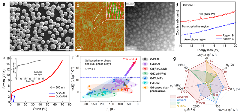 图1 (a) 气雾化制备GdCoAl非晶粉末;(b-c) GdCoAlH样品微观结构分析;(d) 非晶区域和纳米稀土二氢化物电子能量损失谱;(e) 微柱应力-应变曲线;(f) 磁熵变和峰值温度统计图;(g) 综合性能对比图。