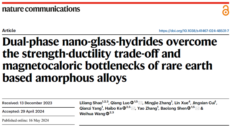 相关成果以“Dual-phase nano-glass-hydrides overcome the strength-ductility trade-off and magnetocaloric bottlenecks of rare earth based amorphous alloys”为题发表在国际期刊《自然通讯》(Nature Communications)。