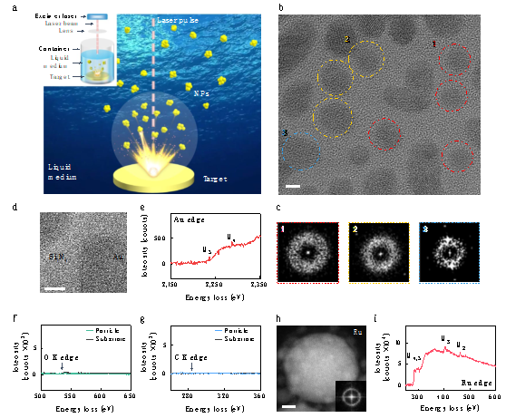图1 采用超快皮秒脉冲激光技术,在无水乙醇(作为助熔剂)中液相烧蚀制备的单质非晶金和钌纳米颗粒。