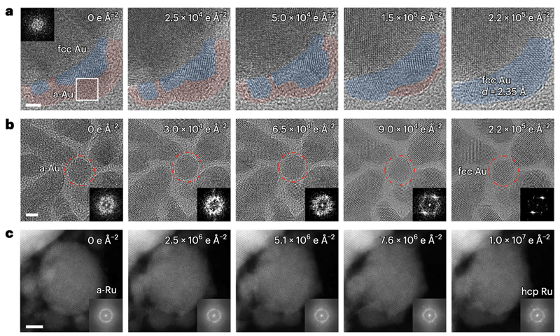 图2 电镜下原位电子辐照单质非晶金和钌的无序-有序转变