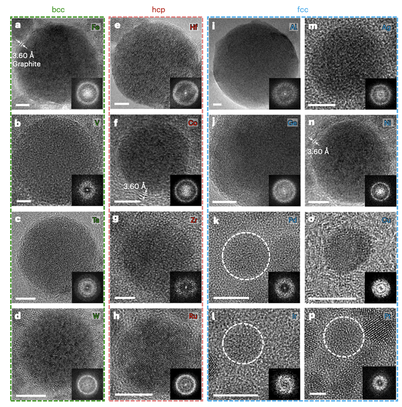为了验证所制备的纳米颗粒为非晶态单质金属,团队采用了双球差矫正透射电子显微镜(Cs-corrected TEM)、电子能量损失谱(EELS)、X射线光电子能谱(XPS)等先进表征技术,对多种晶体类型的单质金属的非晶样品进行了原子结构、成分和电子价态等的详细分析,证实了样品的非晶单质特性(见图1)。此外,通过原位电子辐照实验,观察到单质非晶结构向晶体结构的转变过程,且无序—有序转变后的晶格常数与该金属的晶体晶格常数相匹配。同时发现不同单质非晶之间、同一单质非晶的不同样品之间在电子辐照下的稳定性存在差异,这表明非晶态单质金属的稳定性与其构型密切相关(见图2),也证实了这种构型高通量的方法可以有助于我们筛选到不同构型和不同稳定性的单质非晶。该技术实现了所有结构类型(面心立方、密排六方和体心立方)单质金属的非晶化,进一步验证了该方法的普适性(见图3)。