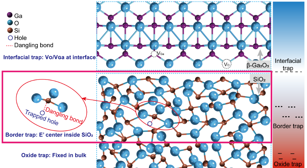 为了解决这一问题,松山湖材料实验室梅增霞研究员团队与山东理工大学张永晖博士等合作者联合开发了一种新型的存储技术,旨在抑制光生电子和空穴的复合,从而延长光电存储器的数据存储时间。具体来说,他们通过巧妙利用β-Ga2O3/SiO2 TFT结构中的边界陷阱(border traps)(图1),有效实现了光生空穴的束缚及其和光生电子的空间分离。这种空间分离能够让电子和空穴在体系的不同层材料中稳定存在,从而延长了它们的寿命,因而大幅提高了数据存储时间。