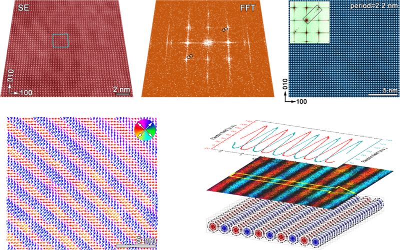 自铁电拓扑结构相继通过实验发现以来,基于外场作用下的原位电子显微学方法证实了拓扑结构及其结构演化的可控性,强化了其作为存储功能单元的可行性。然而,稳定、高密度的存储应用必然依赖于大范围铁电拓扑畴的有序化定向分布,其形成前提是铁电体系内引入周期性的应变、电场分布及沿有序化方向的协同耦合,这就需要通过巧妙的实验设计使铁电体在特定边界条件下实现各种能量态的平衡。以往研究中多数基于超晶格/多层膜中复杂界面效应调控出极性拓扑结构,通常以平行于薄膜表面的一维有序态分布为主要特征。这类一维有序态作为信息技术的功能单元应用于超高密度存储难度较大。