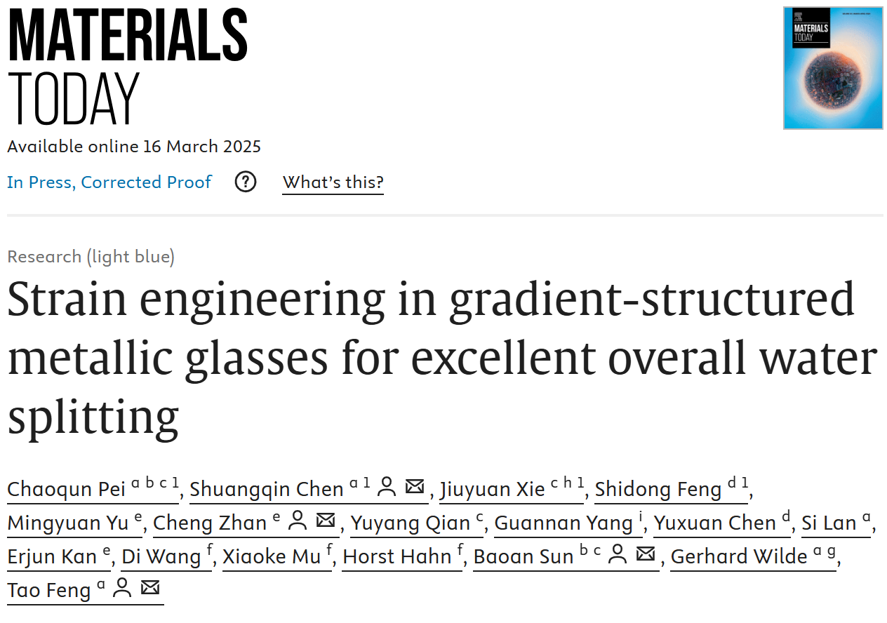 相关研究成果以“Strain Engineering in Gradient-Structured Metallic Glasses for Excellent Overall Water Splitting”为题于2025年3月16日在线发表在Materials Today期刊上。松山湖材料实验室绿色非晶合金团队博士后裴超群为文章的第一作者,陈双琴、解玖远、冯士东为共同第一作者,孙保安研究员、冯涛教授、陈双琴副教授、湛诚教授为本项工作的共同通讯作者。